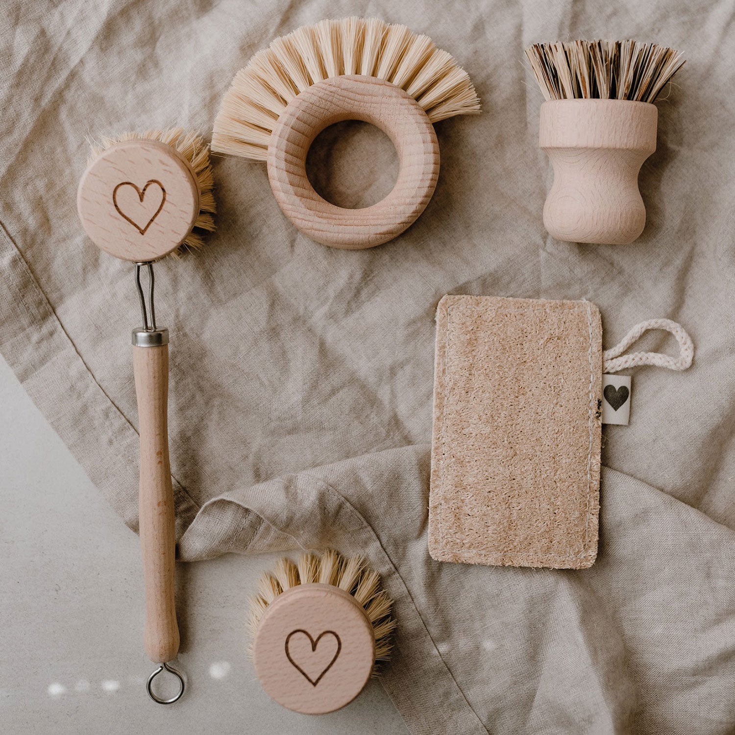 Dieses tolle nachhaltige Spülset von Eulenschnitt ist aus Buchenholz. Bosten aus Naturfasern, ein absoluter hingucker in eurer Küche. Alle 4 Bürsten und die beiden Spülschwämme sind komplett plastikfrei.